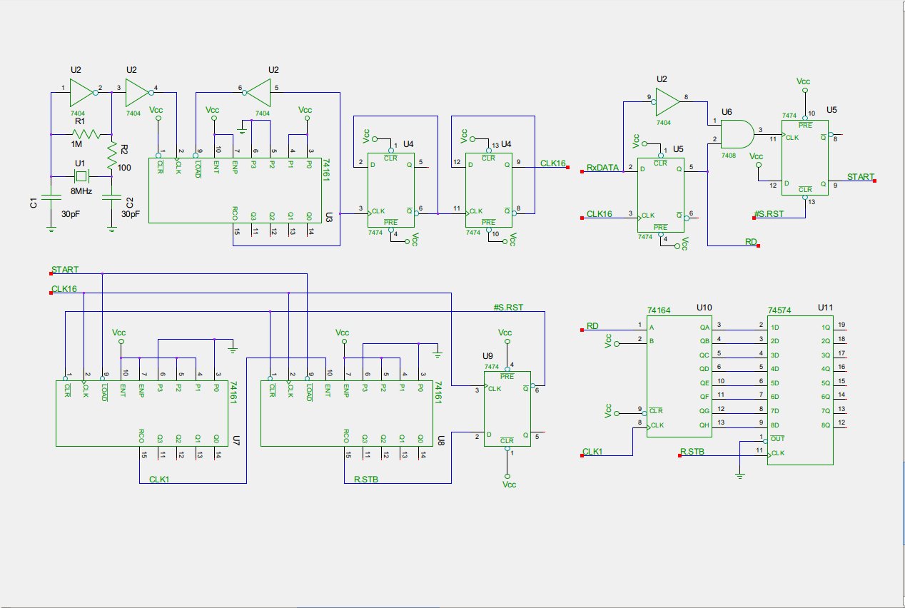 8MHzの水晶発振から÷13÷4で9600bps×16のクロックを作り、スタートビット検出(手抜きしてだたの立ち下がり検出で代用)でシフトレジスタに9個のタイミングパルスを送って最後にラッチし、その後タイミングパルス発生用のカウンタ等をリセットします。