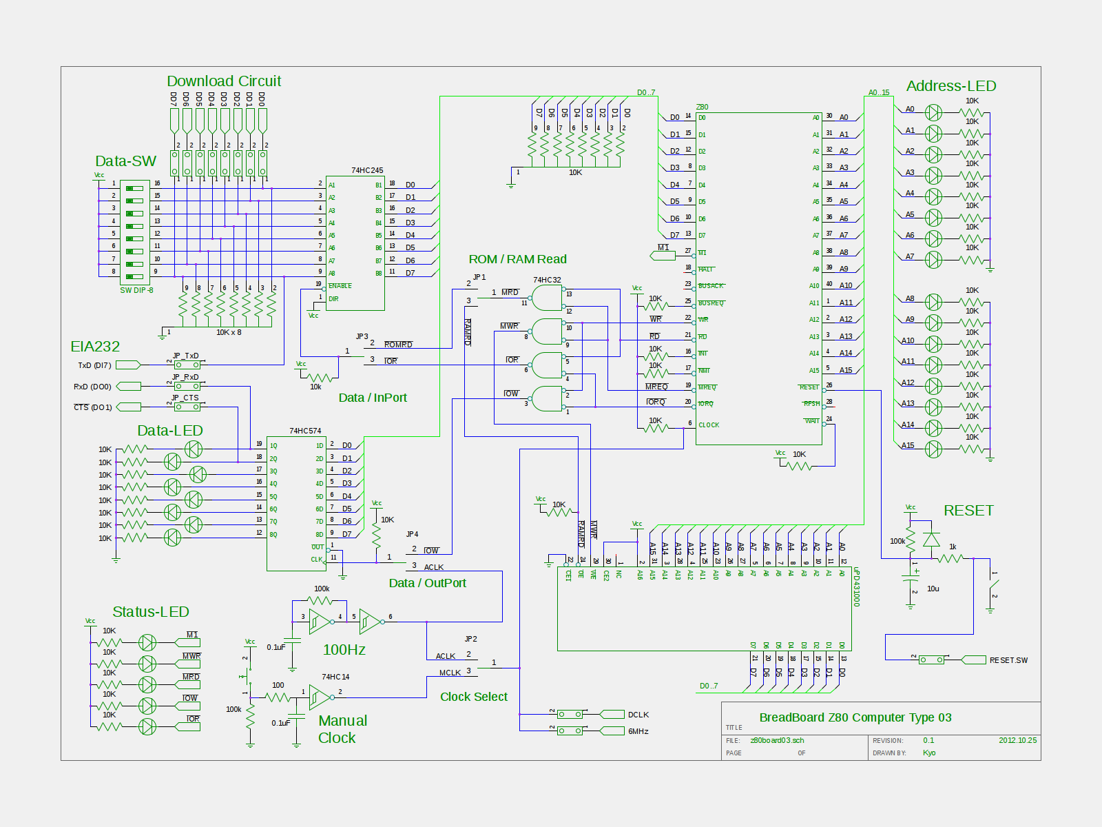 ブレッドボードZ80マイコンのメイン、ダウンロード、シリアルポートの各回路図を少し更新しました。 メイン回路にダウンロード、シリアルポートの接続部分の追加をしたのが主な変更点です。